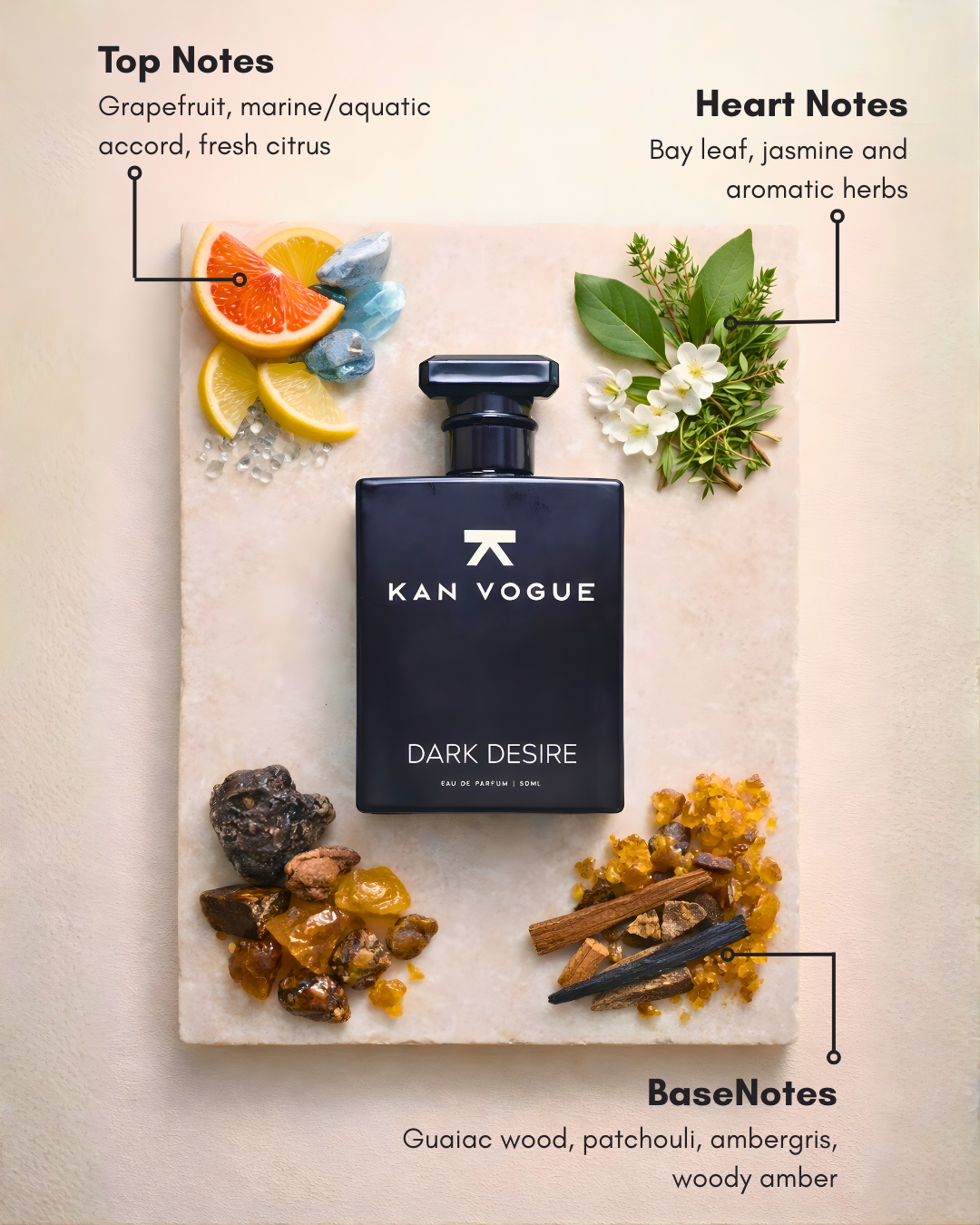 Dark Desire opens with a fresh aquatic burst that feels energetic and lively from the first spray. The citrusy freshness keeps things light and playful, while aromatic herbs and woods slowly add structure as the fragrance develops.